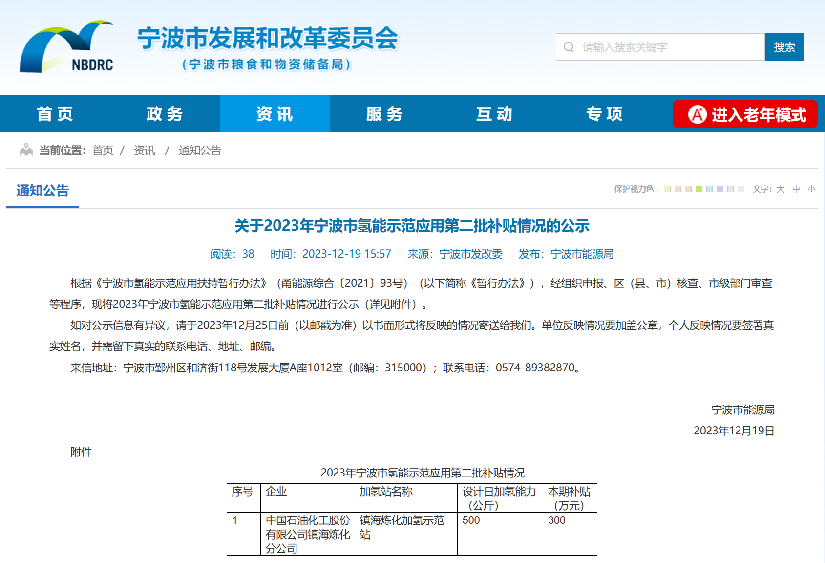 12月19日,浙江寧波市(shì)發改委公(gōng)示(shì)了2023年寧波市氫能(néng)示範應(yīng)用第二批補貼情況,中國石(shí)油化工股份有限公司鎮海煉(liàn)化分公司的鎮海煉化(huà)加氫示範站入(rù)圍,該加氫站設計日加氫能力500公(gōng)斤(jīn),將(jiāng)獲得300萬元的補貼。