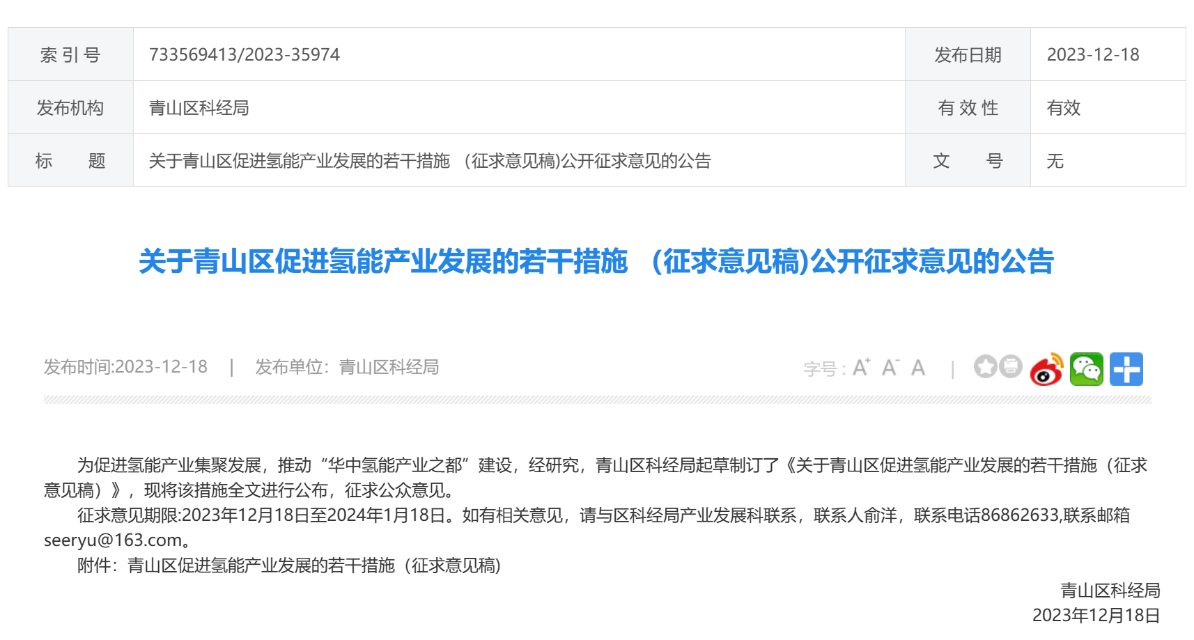 12月18日,青山區科經局發布《關於青山區(qū)促進氫能產業發展的若幹(gàn)措施 (征求意見稿)公開征求意見(jiàn)的公(gōng)告》。
